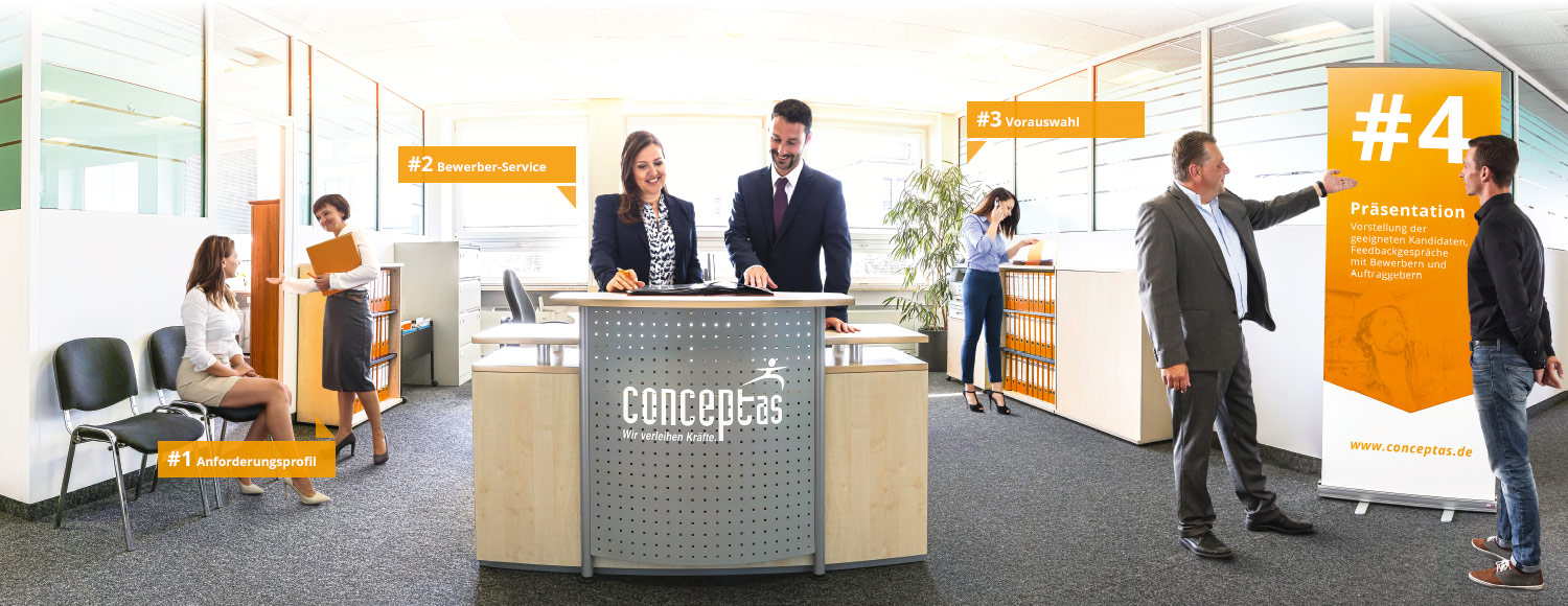Natürlich haben wir immer entsprechend ausgebildete Mitarbeiter zur Verfügung, die wir Ihnen sofort vermitteln können. Dieses Dreiecksverhältnis zwischen Arbeitnehmer, Vermittler und Arbeitgeber existiert bereits seit Jahren sehr erfolgreich und conceptas hat es sich zur Aufgabe gemacht dieses zu revolutionieren, indem wir besonders auf die individuellen Bedürfnisse sowohl des Arbeitnehmers, als auch des Arbeitgebers eingehen. Dabei legen wir auf soziale, wie auch auf leistungstechnische Aspekte besonderen Wert und sorgen für die Zufriedenheit und Motivation unserer Mitarbeiter, damit Sie von deren Fleiß und Engagement profitieren können.